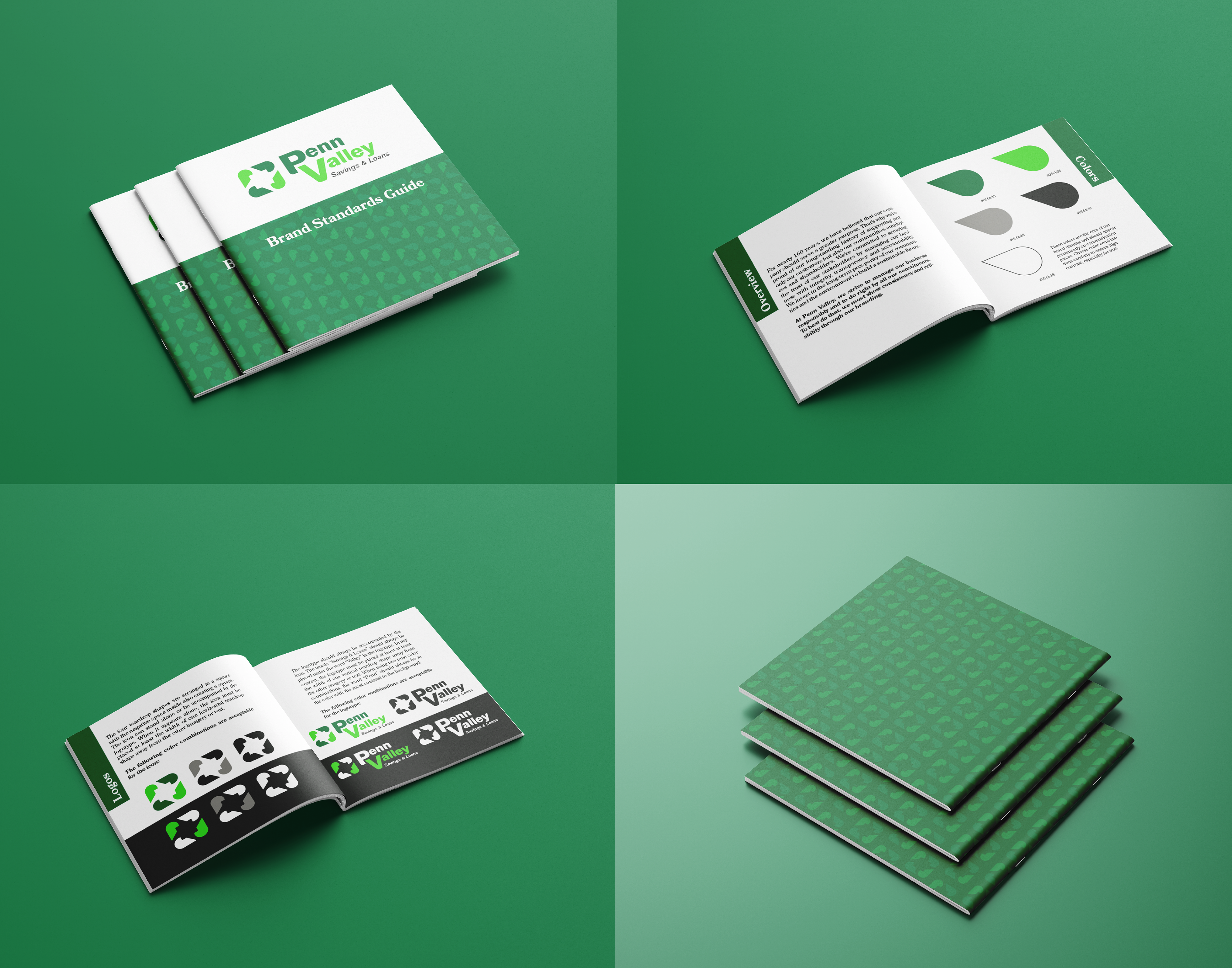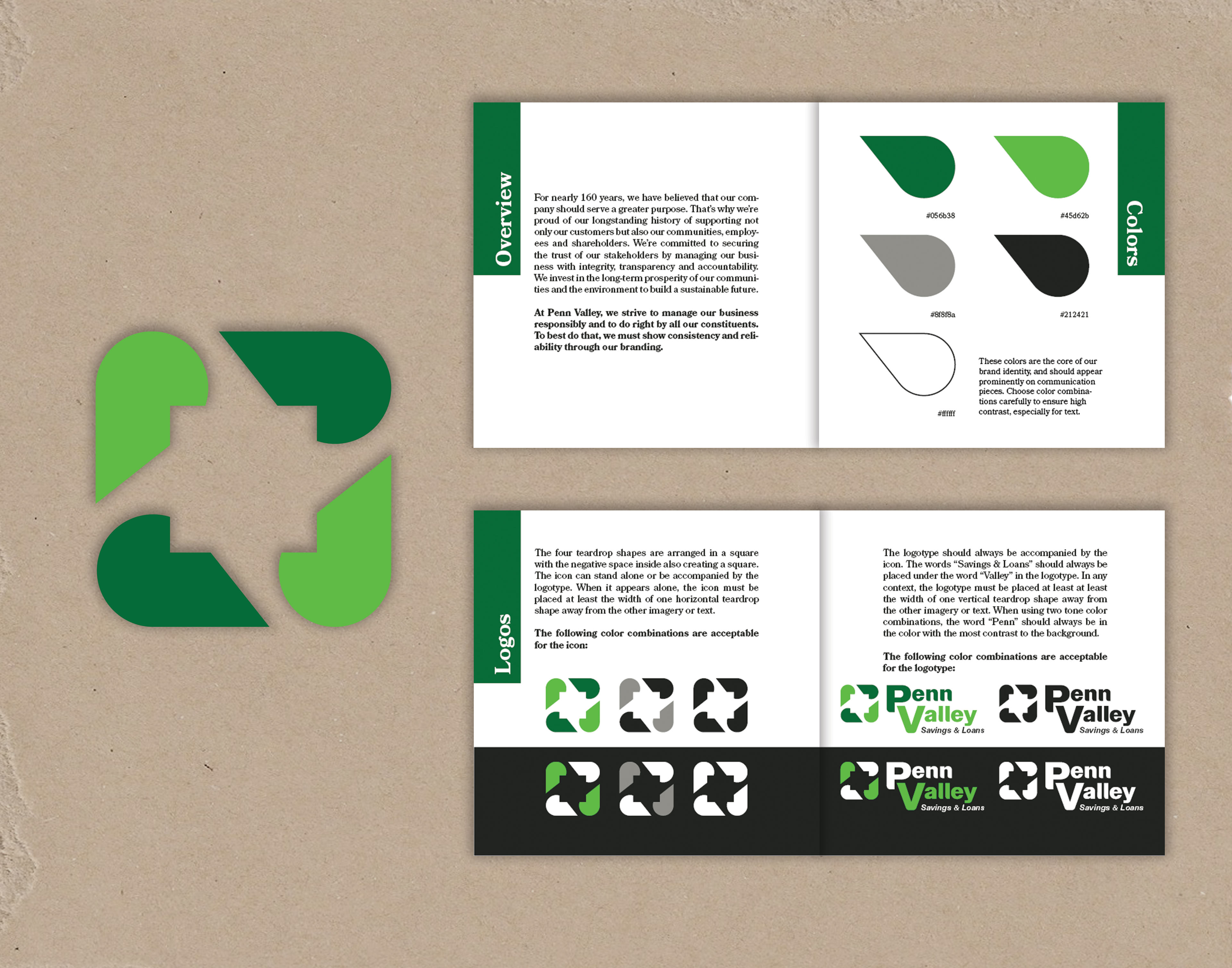 I designed the abstract logo icon to have four teardrop shapes representing the employees, customer, community, and shareholders, forming a rounded square, with the negative space in the middle forming a smaller square. This combination of the stable and reliable profile of a square and the organic and inviting profile of the teardrop neatly encapsulates Penn Valley’s loyalty to serve a greater purpose for the community. I designed the logotype to include rounded corners on the bases of the letter forms to connect seamlessly with the icon. I created the pattern on the bottom of the stationery as well as the pattern on the back to tie those items into the branding.