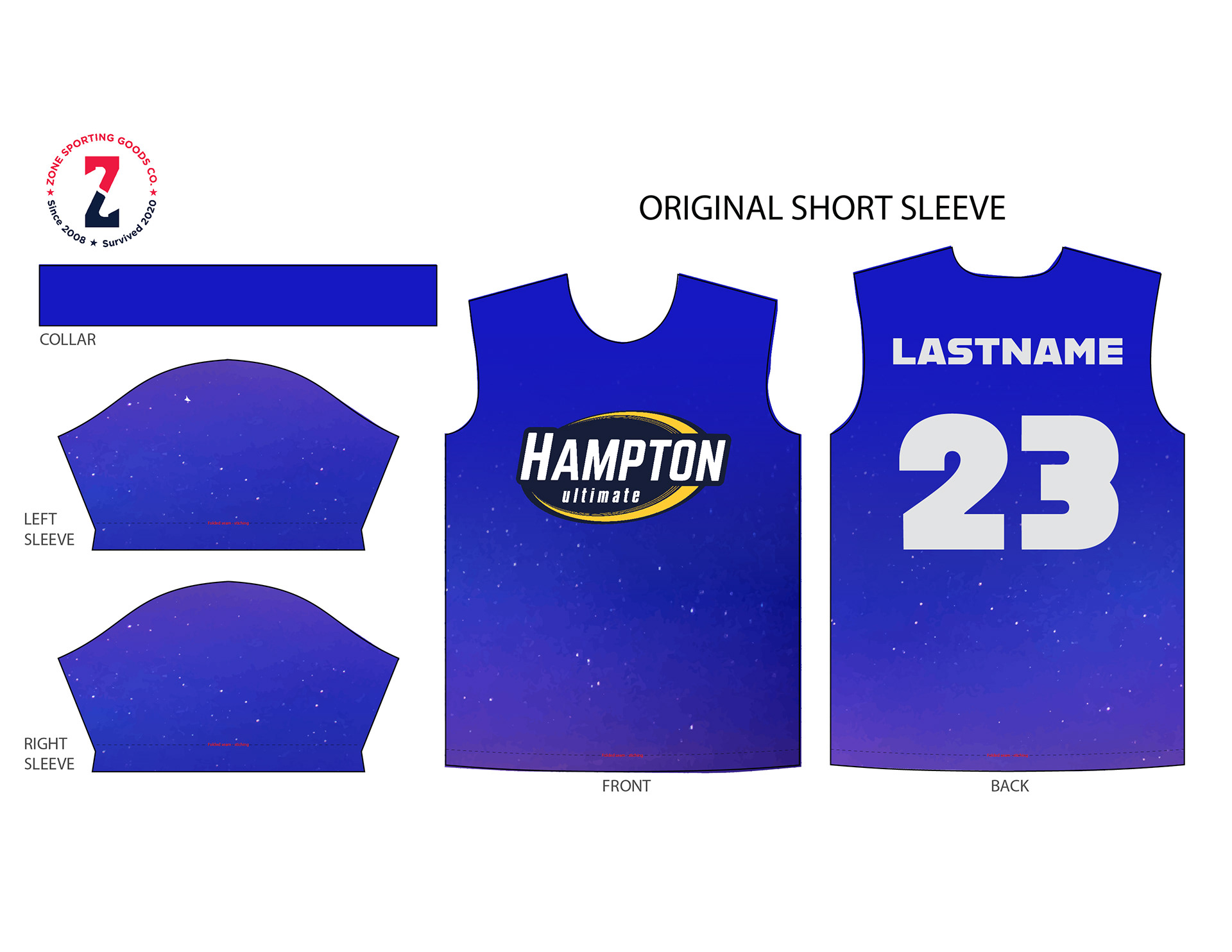 Hampton High School was looking for fresh and exciting designs for jerseys for their ultimate frisbee club team, and I had a great time designing them. The students on the team were asked to brainstorm ideas that they wanted to incorporate in their jersey design, and the consensus included a colorful gradient and a starry sky.